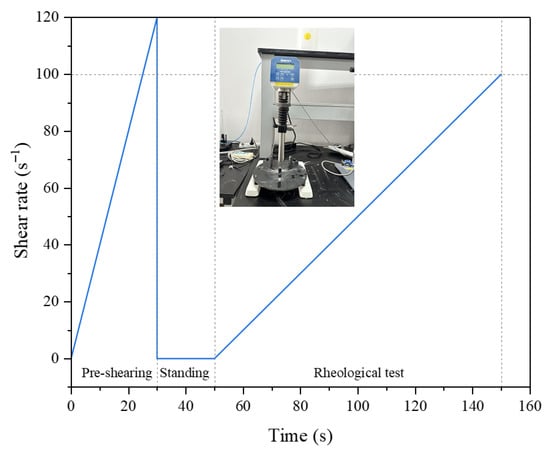 Rheological properties were measured with a Brookfield RST-SST rheometer (Middleboro, MA, USA) under a controlled shear rate mode. First, pre-shear the FAPB slurry at a high shear rate (120 s−1) for 30 s. Subsequently, set the shear rate to increase from 0 to 100 s−1 (100 s), with the program automatically recording data every second (Figure 2). A Bingham model (Equation (1)) was used to analyze the rheological parameters from the data.