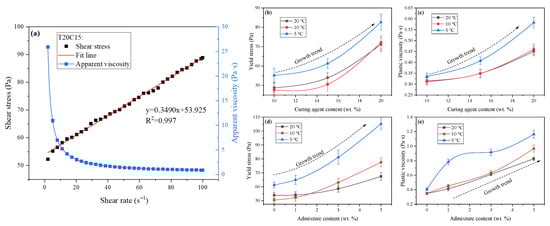 Rheological curves and parameters of the FAPB slurry. (a) Typical rheological curves of the FAPB slurry. (b,c) show the influence of curing agent content on rheological parameters at different temperatures. (d,e) show the influence of admixture content on rheological parameters at different temperatures.