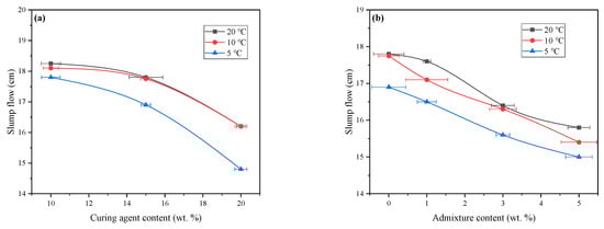 The slump flow of FAPB slurry at different temperatures. (a) Effect of curing agent content. (b) Effect of admixture content.