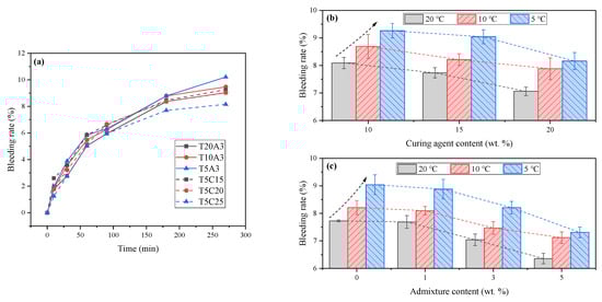 - At the same standing time, the lower the content of curing agent or admixture, the higher the bleeding rate. With identical mix proportions, the bleeding rate increases with decreasing temperature, reaching a maximum of 9.26% (T5C10). At the same temperature, the setting time gradually shortens with increasing content of curing agent or admixture, with the effect of admixture being more pronounced. The final setting time of T20C20 was 8.92% shorter than that of T20C10 (37.22 h). The final setting time of T20A3 was 22.37% shorter than that of T20A0 (35.81 h). Setting time markedly increased with decreasing temperature. When temperature decreased from 20 °C to 5 °C, the final setting time of the C15 series increased by 6.31 h, while that of the A3 series increased by 5.20 h.