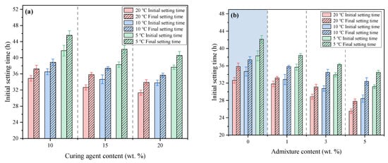 The Setting time of FAPB slurry at different temperatures. (a) Effect of curing agent content. (b) Effect of admixture content.