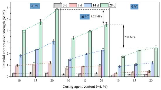 At 10 °C, the 28 d strengths of T10C10, T10C15, and T10C20 were 3.36, 3.95, and 4.52 MPa, respectively. At 5 °C, the 28 d strengths of T5C10, T5C15, and T5C20 were 1.77, 2.27, and 2.51 MPa, respectively. After reducing the curing temperature, the general trends of strength development with curing age and curing agent content remained consistent. In all temperature environments, increasing the curing agent content enhanced the strength at each curing age. However, as the temperature decreased, the strength of samples with the same curing agent content declined significantly. The 28 d strength of samples cured at 5 °C was only equivalent to the strength achieved at 7–14 d under 20 °C conditions. For example, the 28 d strength of T20C20 is 5.84 MPa, while the strength reduction for T10C20 and T5C20 reaches 22.60% and 57.02%, respectively. This further confirms that the hydration rate of the system is highly dependent on the ambient temperature, as higher temperatures significantly promote molecular activity of the reactants, thereby accelerating and enhancing the formation of a network structure.