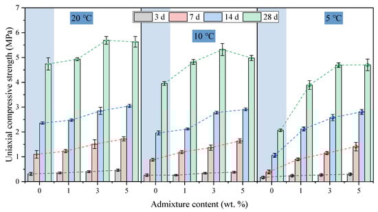 The influence of admixture content on the UCS of hardened backfill is shown in Figure 8. At 20 °C, the 28 d strengths of T20A0, T20A1, T20A3, and T20A5 were 4.74, 4.93, 5.69, and 5.63 MPa, respectively.