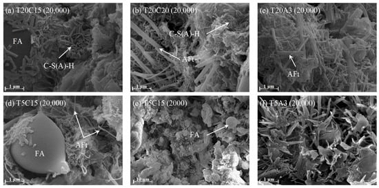 To further investigate the microstructural differences in grout under various conditions, SEM observations were conducted on the microstructures of T20C15, T20C20, T20A3, T5C15, and T5A3 grouts cured for 28 days. The results are shown in Figure 10. It can be observed that, in addition to spherical FA particles, the predominant hydration products are acicular AFt and honeycombed hydrated gel (C-S(A)-H).