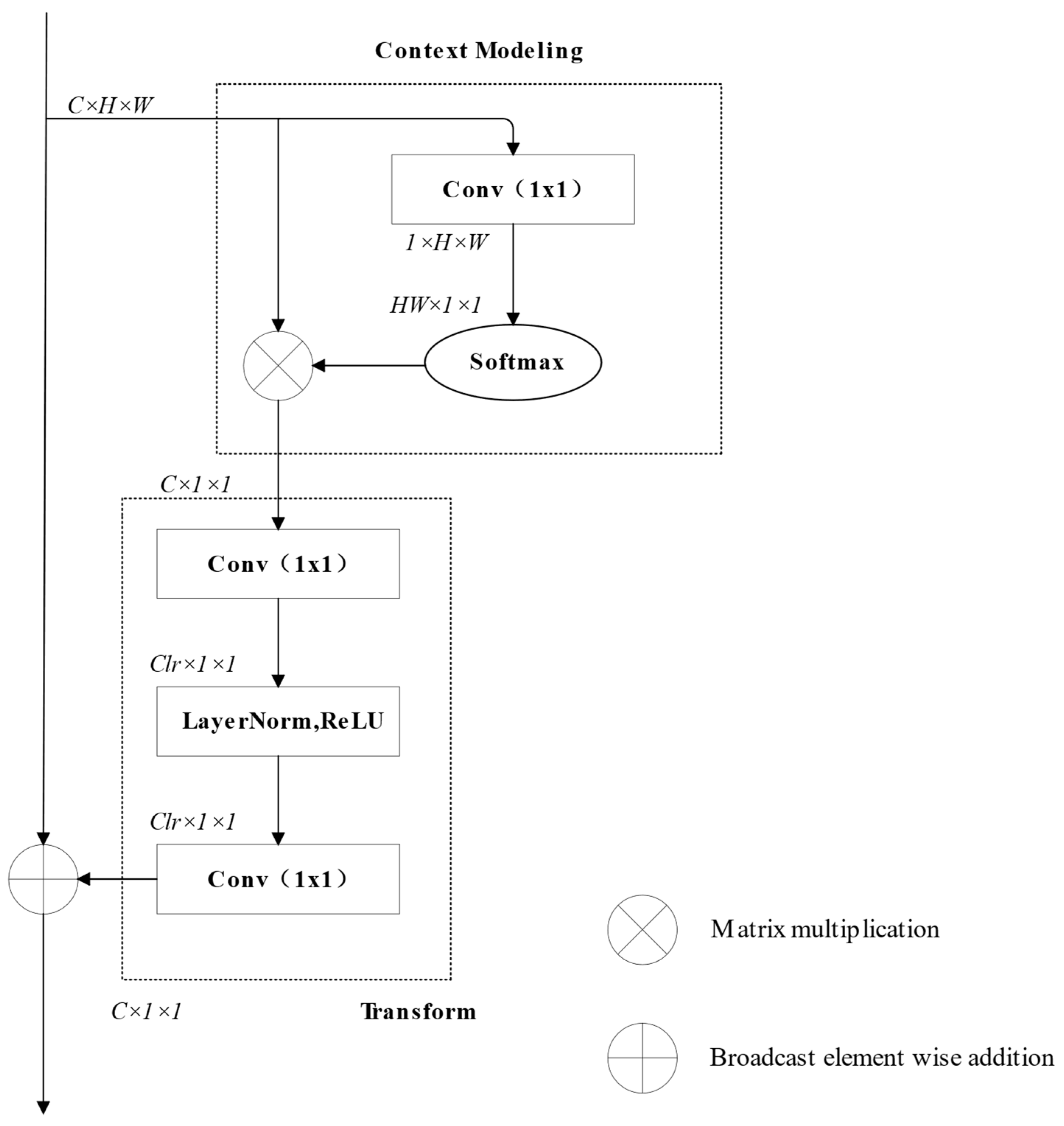 The GCNet, proposed by Cao et al. [25], is designed to efficiently capture long-range dependencies while maintaining computational simplicity, making it ideal for industrial segmentation tasks. As illustrated in Figure 4, GCNet consists of two core components: Context Modeling and Feature Transformation.