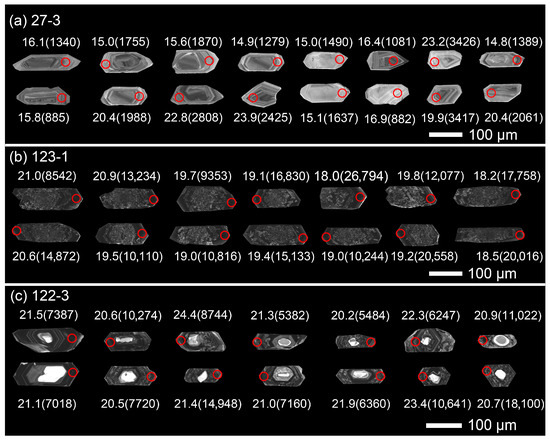 Based on uranium content, zircons from the studied leucogranites are predominantly categorized into two types: “low-U” (type I) and “high-U” (type II). The type I zircons are characterized by relatively low U content (mostly <5000 ppm), and have not undergone metamictization, and therefore display obvious oscillatory zoning patterns (Figure 2a); these zircons are euhedral, with long to short prismatic shapes, and mostly 100–250 μm in length with length/width ratios of ~1:1 to 5:1 (Figure 2a). The type II zircons have relatively high U content (mostly >5000 ppm), and have undergone extensive metamictization, and therefore exhibit a sponge-like texture (Figure 2b,c); these zircons show euhedral, long and/or short prismatic forms, and have lengths of 100–300 μm with length/width ratios of ~1.5:1 to 5:1 (Figure 2b,c). Some type II zircons without core-rim structures typically show dark luminescence in the CL images (Figure 2b). Some type II zircons exhibit a distinct core-rim structure (Figure 2c). The inherited cores are characterized by bright luminescence, variable shapes, sizes, and zoning patterns in the CL images; the rims show dark luminescence and oscillatory zoning (Figure 2c). Apart from the U content, there is no significant difference in the composition of other trace elements between type I and type II zircons (Figures S2 and S3). Furthermore, on the diagrams of Hf versus Ti, TTiZ, Th/U, (Yb/Gd)N, Nb, and Ta of zircons, type I and type II zircons show similar trends of variation (Figure S4). In this case, the metamictization does not change the composition and related evolutionary trends of other zircon elements except for the U. Therefore, we will not make a distinction in the following discussion.