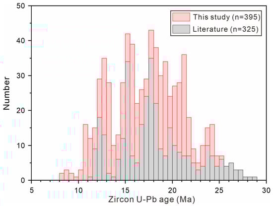 U-Pb age histogram of zircons from the Himalayan leucogranites. Data and sources are given in Tables S1 and S3. The literature data include only precise U-Pb ages; the approximate ages (e.g., “ca”) were excluded.
