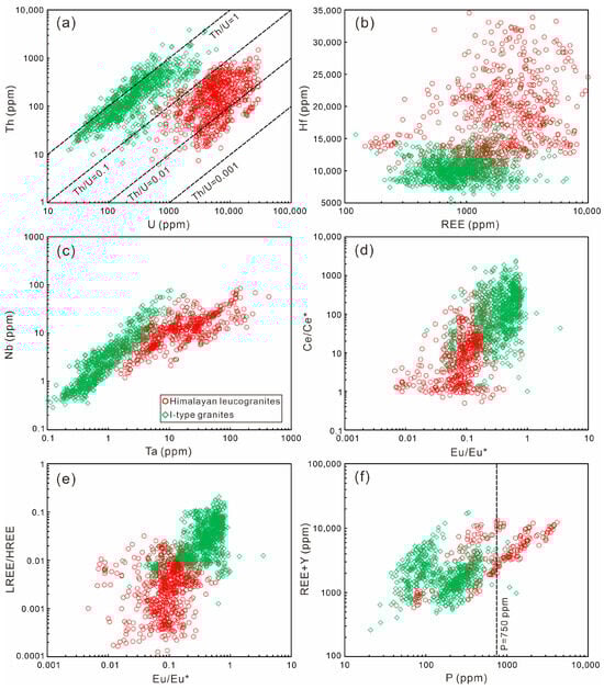 (a) Th versus U, (b) Hf versus REE, (c) Nb versus Ta, (d) Ce/Ce* versus Eu/Eu*, (e) LREE/HREE versus Eu/Eu*, and (f) REE+Y versus P diagrams of zircons from Himalayan leucogranites and I-type granites. Data sources are listed in Tables S1–S3. REE-rare earth elements; LREE-light rare earth elements; HREE-heavy rare earth elements.
