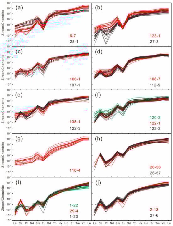 Chondrite-normalized REE patterns of zircons from the studied leucogranites. Chondrite values are from Sun and McDonough [58].