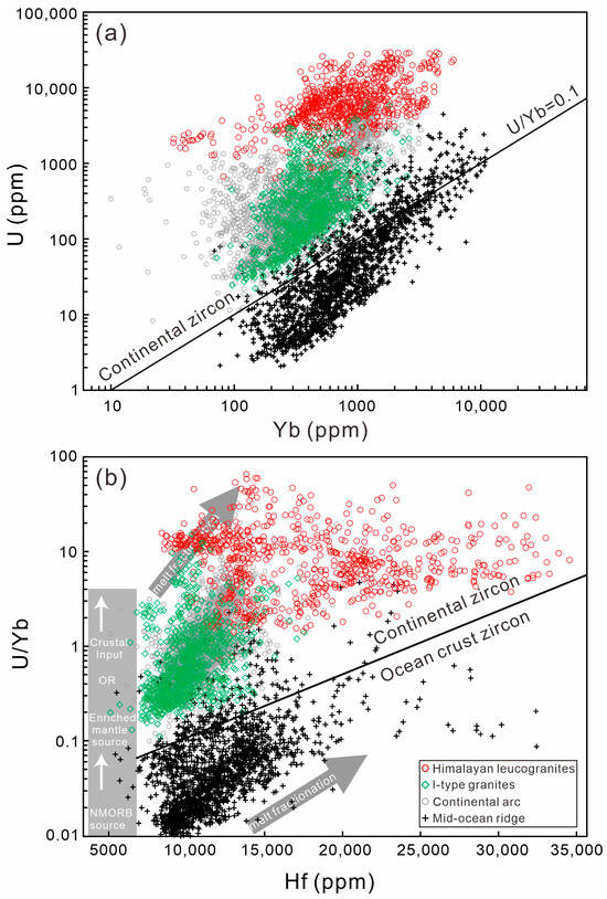 (a) U versus Yb and (b) U/Yb versus Hf diagrams for continental and ocean crust zircons. The zircon data and sources of Himalayan leucogranites and I-type granites are given in Tables S1–S3, and zircons in continental arc and mid-ocean ridge are from Grimes et al. [13].