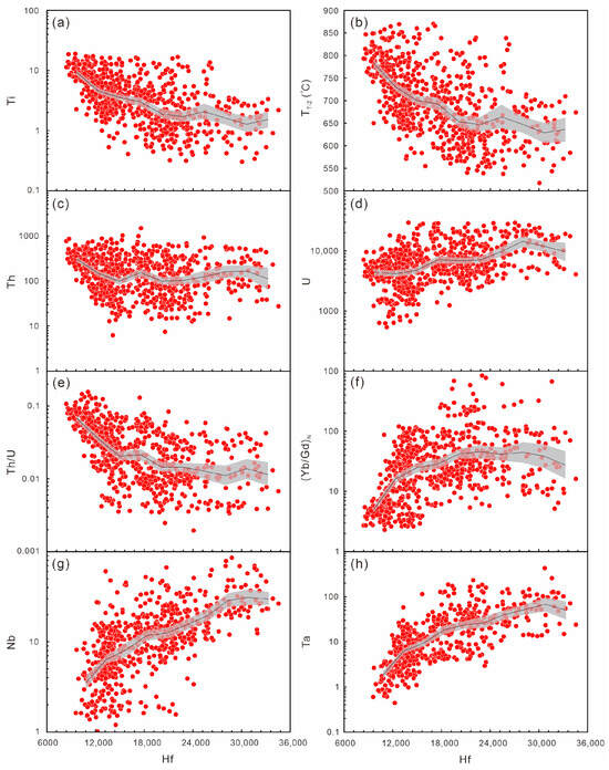 Trace element concentrations and ratios in magmatic zircons often show regular variations with magma evolution [41,42,73]. For instance, Hf content in zircon typically increases during progressive fractional crystallization of granitic magmas and is therefore widely used as a proxy for the degree of evolution [2]. The Ti contents and corresponding Ti-in-zircon temperatures (TTiZ) are inversely correlated with Hf (Figure 7a,b). In this case, Hf increases, and Ti and TTiZ decrease systematically, indicating progressive magma cooling during zircon crystallization.