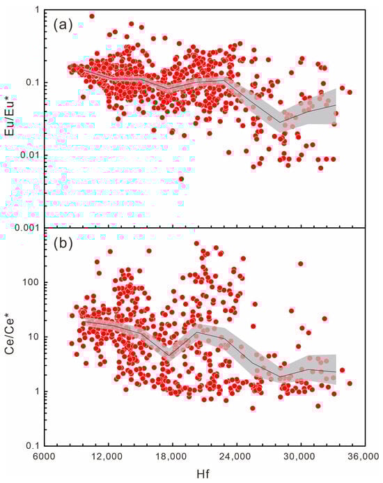 (a) Hf versus Eu/Eu* and (b) Hf versus Ce/Ce* diagrams of zircons from Himalayan leucogranites. Data are plotted as scatter points along with binned bootstrap trends. For each plot, the data were divided into 10 equal-width bins along the X-axis, and 2000 bootstrap resamples were performed within each bin to estimate the median trend (solid line) and its 95% confidence interval (shaded region).