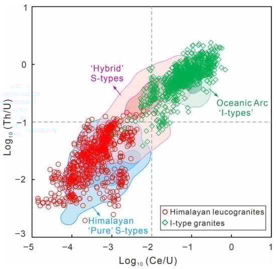 To re-evaluate discrimination between I- and S-type granites using zircon trace element compositions, Roberts et al. [9] recently compiled a comprehensive dataset of trace element data of zircon from diverse magmatic suites and metapelites, and proposed a new discrimination method based on a log10 (Ce/U) vs. log10 (Th/U) diagram based on Th and Ce depletions characteristic of anatectic melts formed under monazite-saturated conditions (Figure 9). In this diagram, the Himalayan ‘pure’ S-type zircons overlap the metapelite-derived field, with both falling within the bottom left quadrant. The ‘oceanic arc’ I-type zircons overlap the presumably sediment-free ‘mantle-derived’ field, with both occupying the top right quadrant (Figure 9). Zircons from other S-types (i.e., hybrid granites) are located between the zircons in the Himalayan ‘pure’ S-types and the ‘oceanic arc’ I-types (Figure 9).