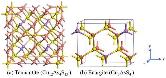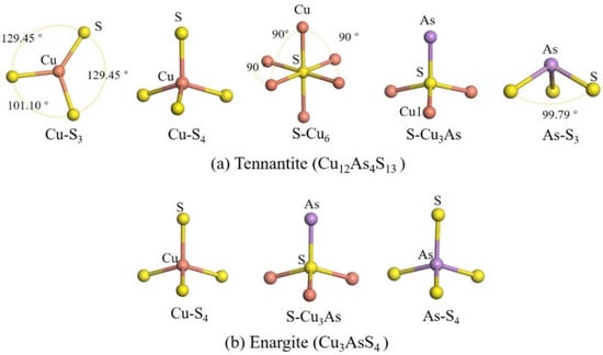 Figure 2 shows the coordination environments of the atoms. In tennantite, Cu atoms exhibit both 3-fold and 4-fold coordination, present in equal amounts [4], forming planar triangular and tetrahedral structures, respectively. As atoms are 3-coordinated, resembling the ammonia molecule structure. S atoms show both 4-fold and 6-fold coordination, forming tetrahedral and octahedral structures. In enargite, all Cu, As, and S atoms are 4-coordinated.