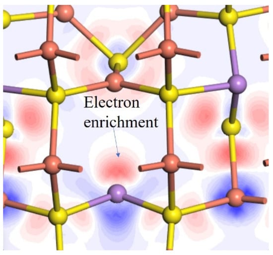 The As atom in tennantite exhibits a 3-coordinated structure analogous to the arsenic hydride molecule (AsH3). The As in AsH3 has a pair of lone electrons and is prone to oxidation. To investigate whether there are also lone pairs of electrons in the As of AsS3, the differential charge density of arsenic was analyzed, as shown in Figure 3. It can be observed that in Tennantite, on the side opposite to the three As-S bonds, there is an electron-rich region (red area), confirming the existence of lone pair electrons on the As atom.