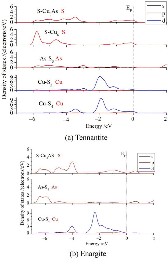The DOS of As 4p in tennantite is low and flat in the range of −6 eV to −4 eV, whereas the As 4p DOS in enargite shows a higher and more concentrated peak at lower energies, between −7 eV and −5.5 eV. This suggests that the arsenic in enargite is more stable, while the arsenic in tennantite is more reactive and potentially more easily oxidized.