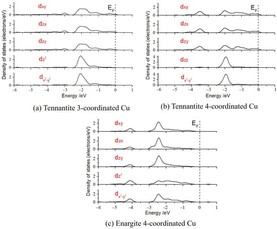 It can be observed that in tennantite, the energies of the five d-orbitals for the 4-coordinated tetrahedral Cu are similar to those of the 3-coordinated planar triangle copper. In contrast, the d-orbital energies of the 4-coordinated Cu in enargite are significantly lower than those in tennantite (approximately 0.4 eV higher in tennantite).