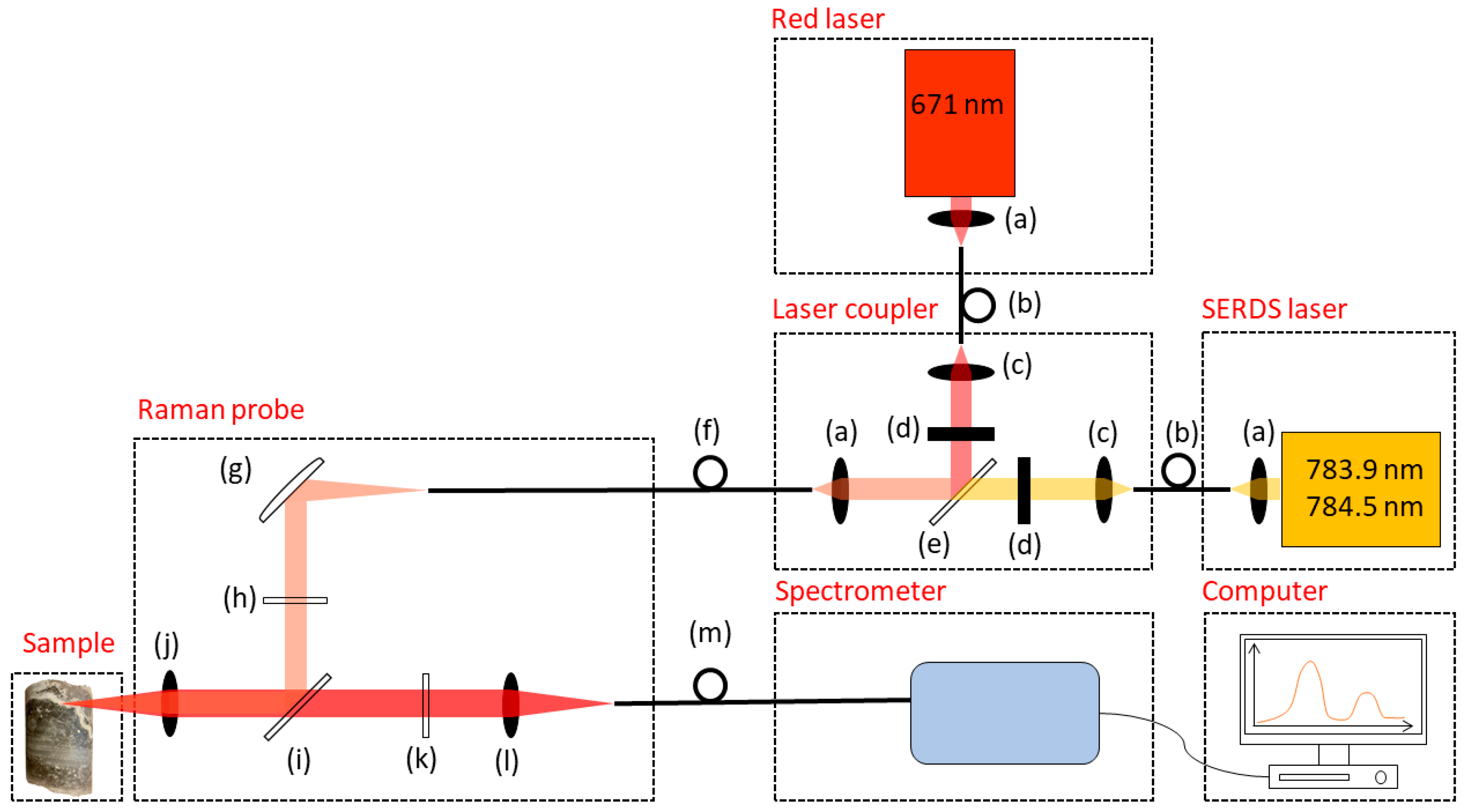 Figure 2, the laser radiations from the “Red laser” (MLL-FN-671-800 mW laser, PhotonTec Berlin GmbH, Berlin, Germany; emission wavelength 671 nm) and the “SERDS laser” (dual wavelength-Y-DBR-RW-Diode laser, Ferdinand-Braun-Institut gGmbH, Berlin, Germany; emission wavelengths tuneable and switchable between two wavelengths in the vicinity of 785 nm) are focussed into the glass fibres of 50 µm core diameter (b) using focussing lenses (a) and are brought to the laser coupler. The laser coupler enables the alignment of the red and the SERDS laser radiations into a single Raman probe. Using the collimating lenses (c) and a beam splitter (e), another collimator (a) launches the radiation into the so-called excitation glass fibre of 200 µm core diameter (f), which carries the excitation radiation into the Raman probe. Electrically driven laser shutters (d) are installed between the beam splitter (e) and collimating lens (c) for the alternate turning OFF/ON of the radiation coming from the red or the SERDS laser. They assure that the radiation of the red and the SERDS laser is transferred to the Raman probe one after the other.