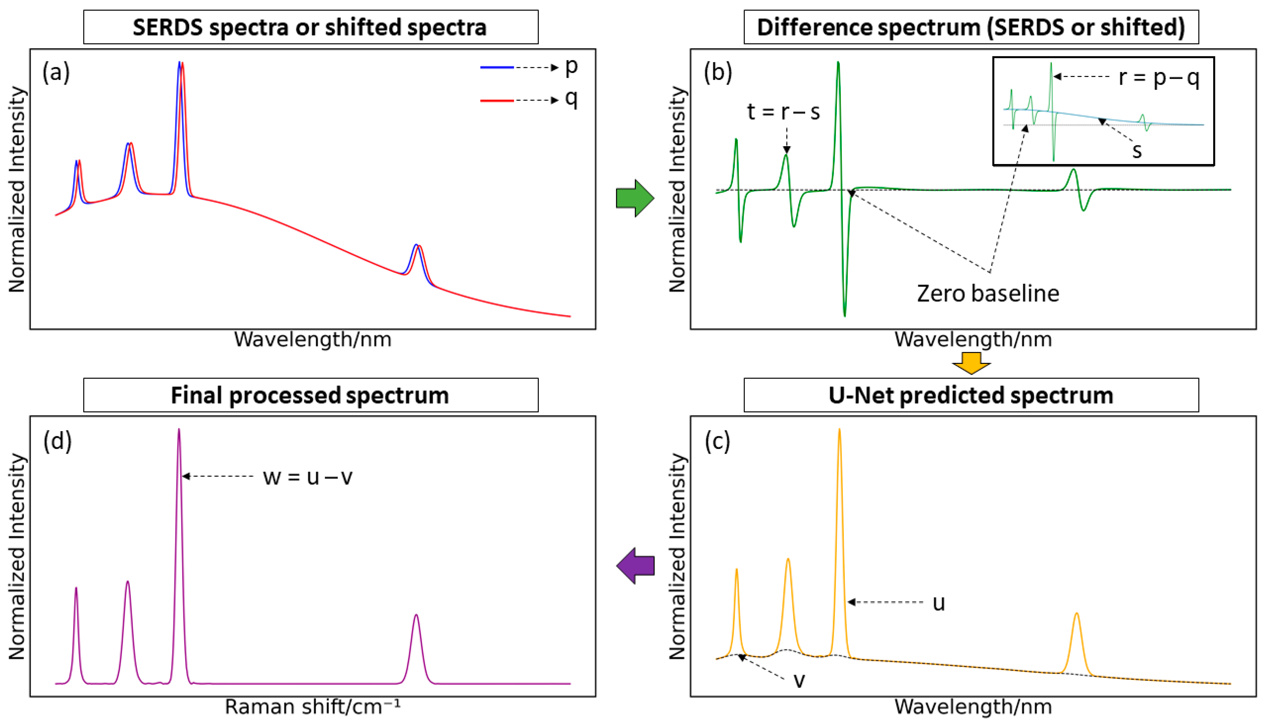 For the large Raman shift region of the Raman spectra, the pre-processing method is almost the same as that of the fingerprint region. Since only one excitation wavelength of 671 nm is available (p), a second spectrum (q) for calculating the difference spectrum (r) is mathematically synthesized by shifting the spectrum obtained with 671 nm by 0.15 nm. As we did not shift the excitation wavelength in this case but the spectrum, we refer to the resulting difference spectrum in the large Raman shift region as difference spectrum, while we refer to the resulting difference spectrum in the fingerprint region as SERDS spectrum. A shift of 0.15 nm corresponds to the minimum wavelength difference between two pixels. The minimum value is chosen to have minimum noise in the non-peak regions when the difference spectrum is calculated. The U-Net model was trained on full-range Raman spectra (0 cm