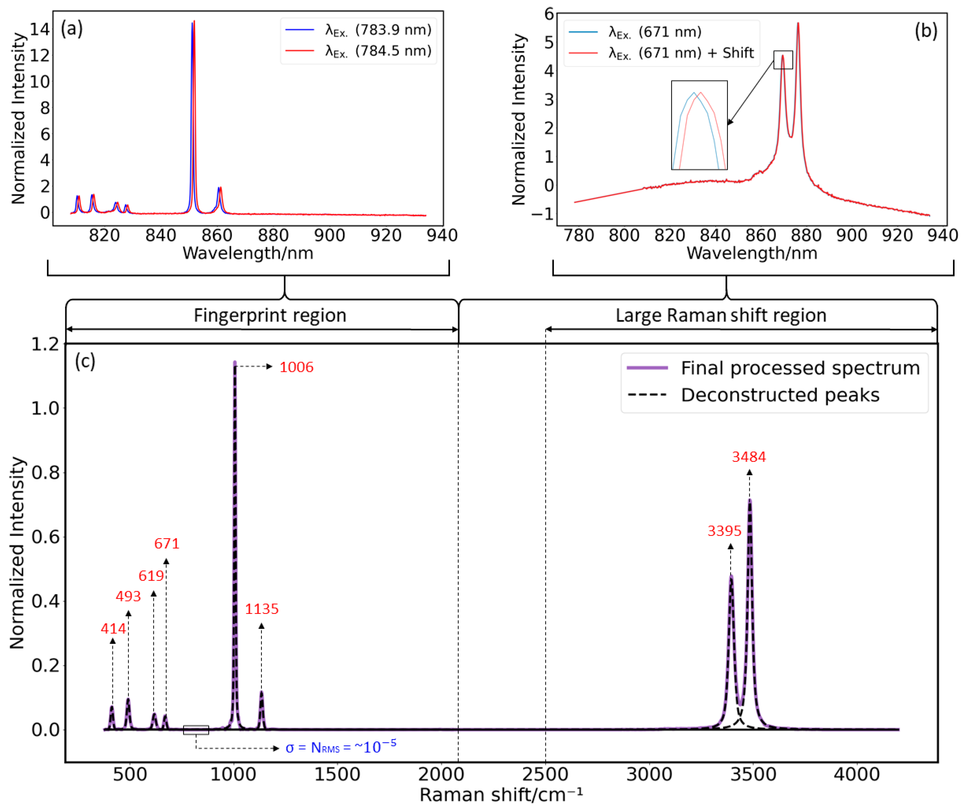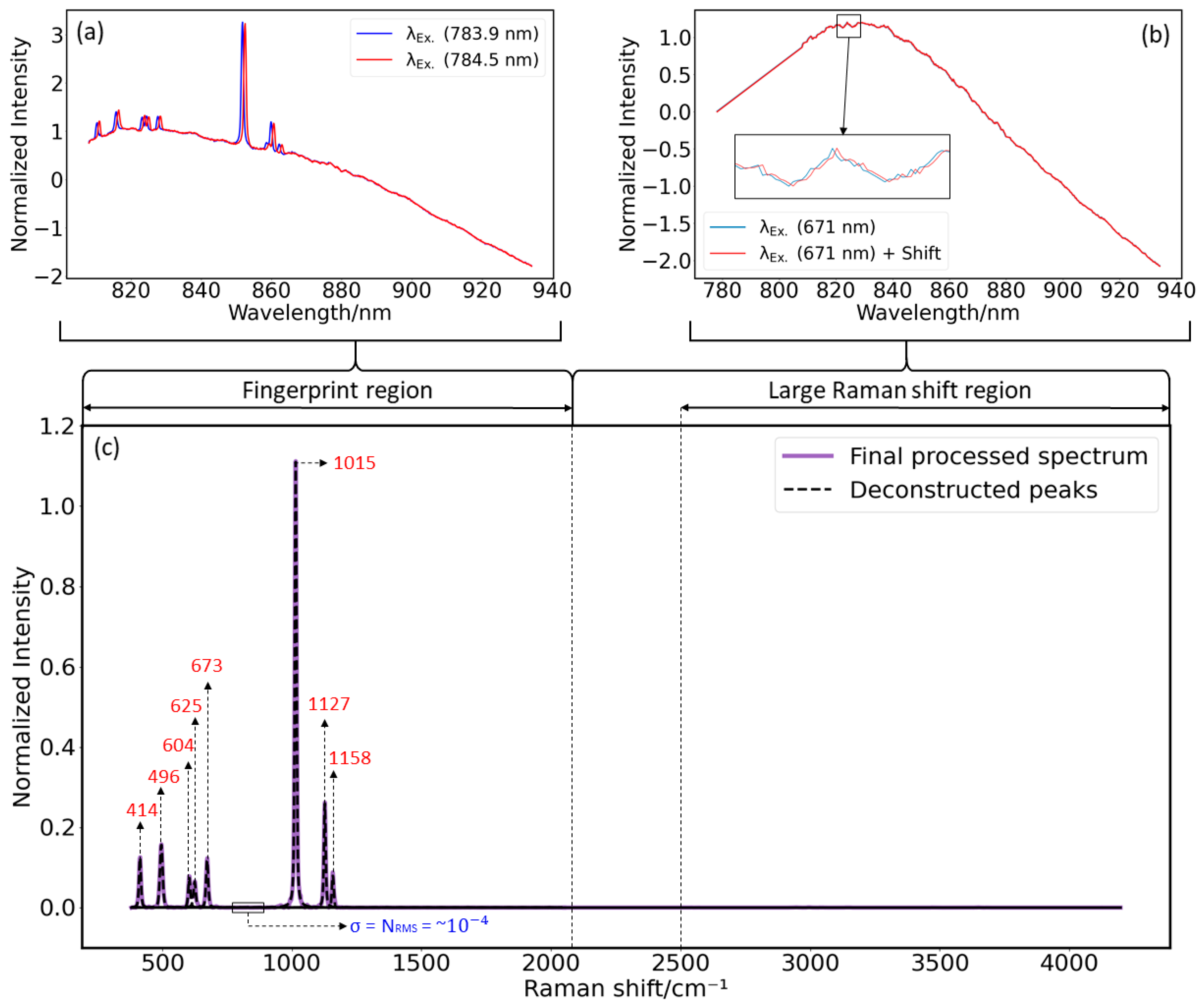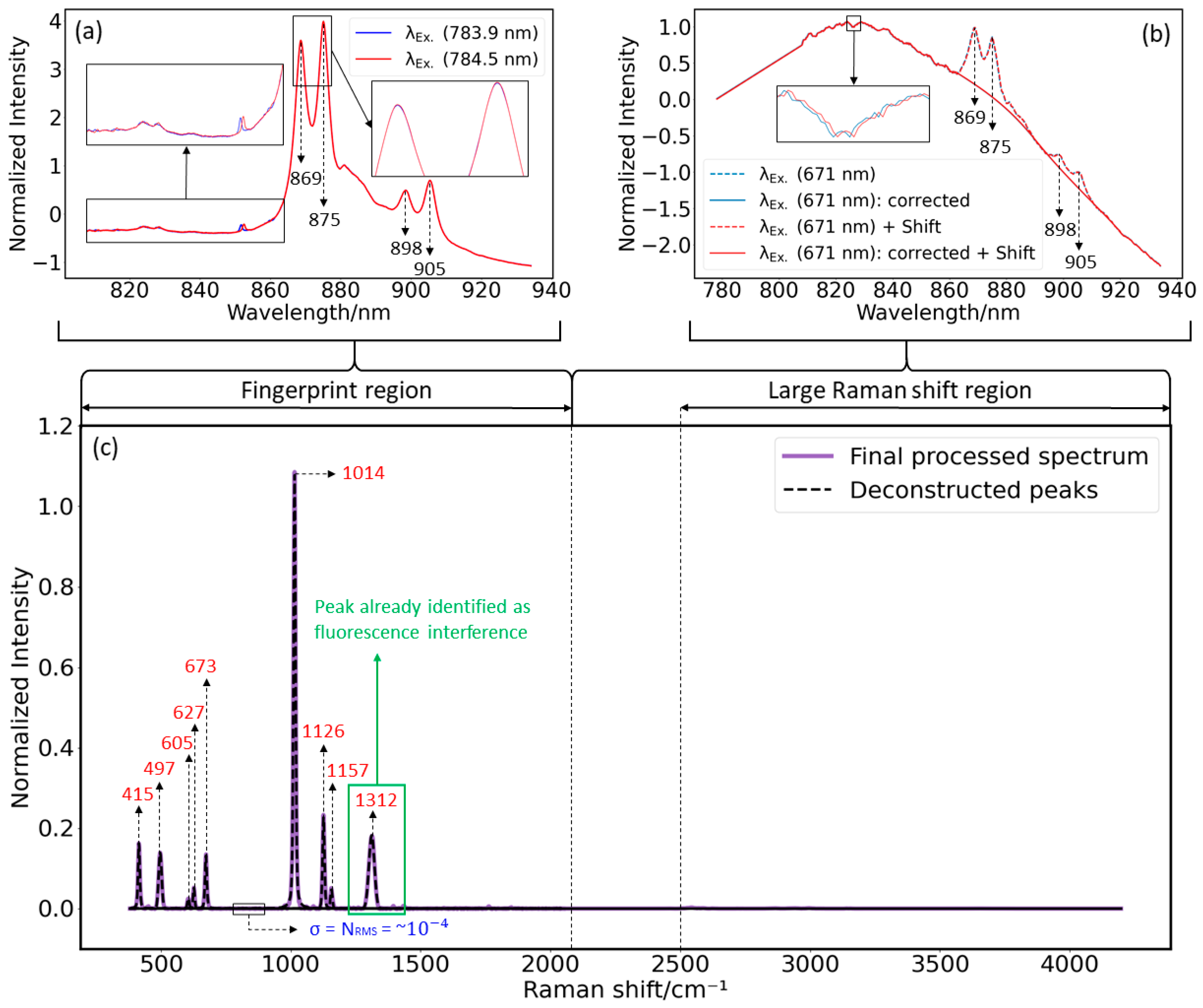 Figure 5a, the fluorescence interference does not change its position; hence, any remaining fluorescence interference that appears close to strong fluorescence interference in the final processed spectrum could be identified as part of the fluorescence interference, and the corresponding pseudo-Voigt peak can be easily discarded.