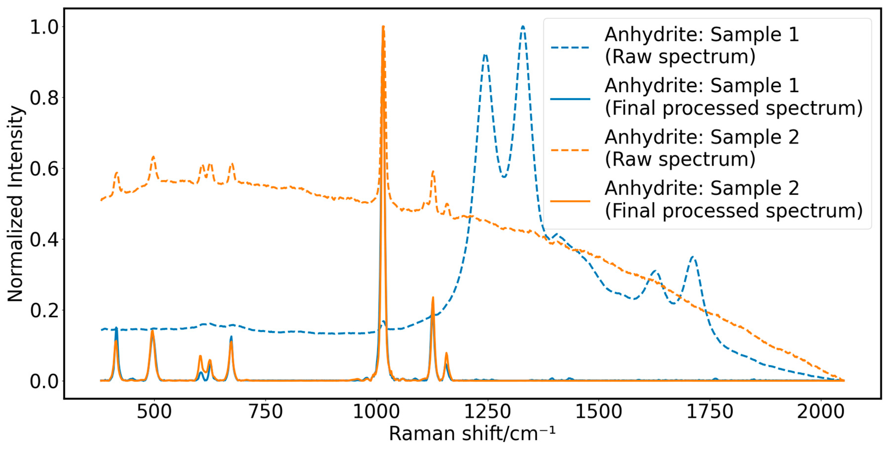 Figure 6a obtained with 783.9 nm excitation wavelength. Both the raw spectra and the final processed spectra are normalized between 0 and 1 for comparison. As one can observe, the raw fingerprint region Raman spectra (dashed curves) of both anhydrite samples differ largely from each other. Without the pre-processing method, the raw Raman spectrum of anhydrite sample 1 can easily be mistaken for other minerals due to the narrow fluorescence interference at Raman shift values of 1249 cm