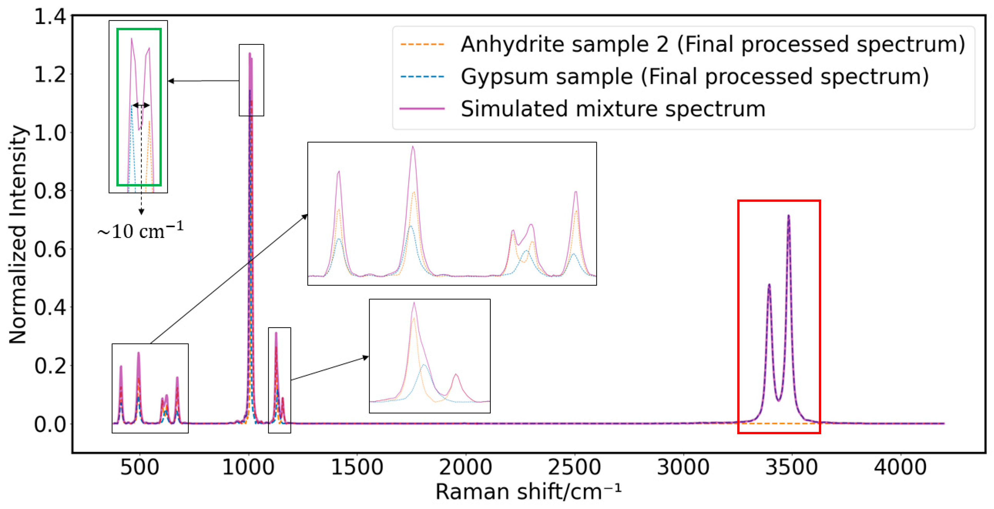 Figure 8. From the simulated mixture spectrum, it can be observed that most of the gypsum Raman peaks overlap with Raman peaks of anhydrite. As a result, the fingerprint region Raman spectra of the mixture spectrum can easily be mistaken for an anhydrite spectrum. The presence of gypsum is indicated only by small features, which are highlighted in