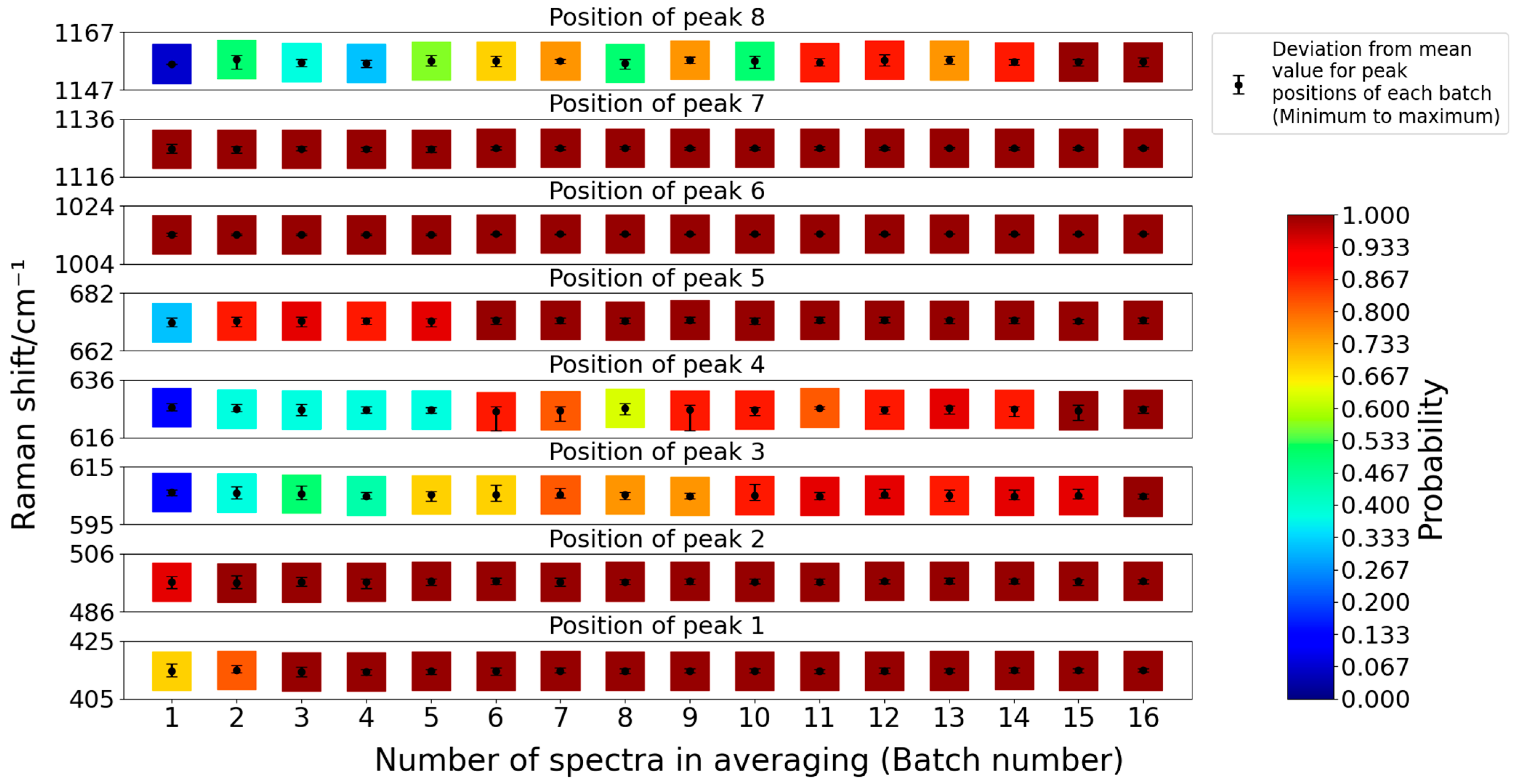 Figure 9 corresponds, for example, to batch number 5 and peak number 8. The greenish background colour implies that this peak was represented by a pseudo-Voigt profile in approximately 50% of the 16 final processed spectra of this batch. Thus, in 8 of these 16 final processed spectra, this peak was not recognized. The data point and the error bars represent the mean central position of this peak, which was averaged from the eight identified peaks, and their deviation between maximum and minimum peak positions among these eight identified peaks, respectively.
