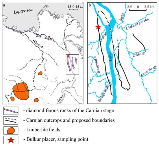 Schematic map of Carnian diamondiferous rock location on the northeastern Siberian platform (a); enlarged fragment of the selected area (b).