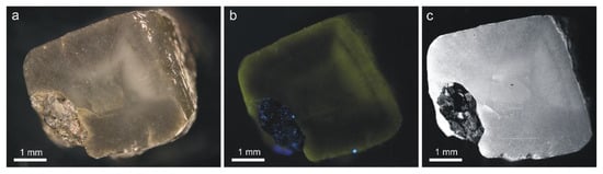 On a polished section along (100) taken through the center of the crystal 8082, its fibrous zonal structure was visually observed in reflected light (Figure 3a). The greenish-yellow fluorescence of the surface under UV radiation (365 nm) more clearly reveals the zonal–sectorial fibrous structure of the crystal with parallel fiber orientation in the <100> growth pyramids (Figure 3b). The cathodoluminescence image of the cut surface does not show the sectorial structure of the crystal, but its fibrous structure and cracks in the diamond become more visible (Figure 3c).