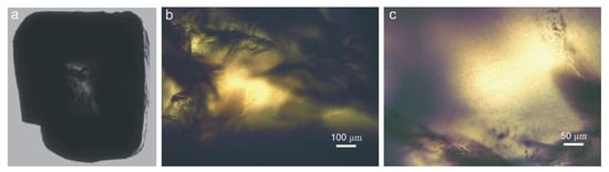 The central translucent region of the crystal is rectangular and saturated with unevenly distributed, isometric, dust-like microinclusions (Figure 4a). The microinclusions are generally uniform in size, approximately 2 µm, but increase slightly to 4–5 µm in clusters (Figure 4b,c). This may be due to an increase in size as a result of local fusion of inclusions.