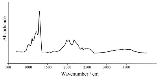 The IR spectrum of a plane-parallel plate of cuboid diamond 8082 was recorded through the central transparent region. A spectrum with a spectral resolution of 2 cm−1 was obtained integrally from 50 scans (Figure 5).