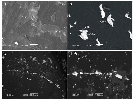 Mineral segregations on the surface of a diamond crystal (scanning electron microscope): (a) thin crusts of chamosite (Chm) tightly attached to the diamond surface (BSE); (b) crystalline scaly segregations of chromferide (Cr-Fe) in the depressions of the diamond microrelief; (c,d) mineralized protogenetic crack in a diamond filled with chamosite (Chm).