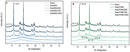 The obtained materials were divided into four fractions: one fraction remained untreated while the other three were calcined at 400 °C, 700 °C, or 1000 °C for 24 h in a muffle furnace. The temperatures chosen for thermal treatment were based on the phase transitions of titanium to anatase, rutile, and brookite, respectively, as reported in previous studies [41]. These were named accordingly, with the temperature of calcination added to the names, resulting in Kaol-TiO2-T or Kaol-Nb-T, where T = 400, 700, or 1000, depending on the thermal treatment temperature.