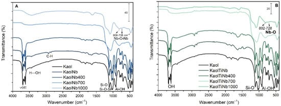 FTIR spectra of (A) KaolNb and (B) KaolTiNb, resulting from the reaction of kaolinite with Nb5+ or Ti4+/Nb5+ ions via sol–gel process.
