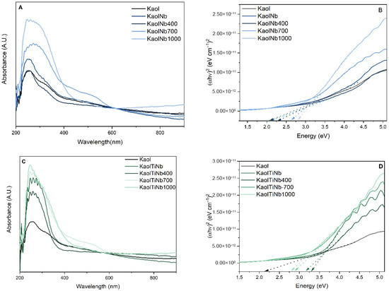UV-Vis DRS of (A) KaolNb materials and (C) KaolTiNb materials, and (B,D) bandgap diagram of the materials calculated by Tauc plot. Dashed arrows pointing to the Energy (eV) axis indicate the bandgap energy of each material.