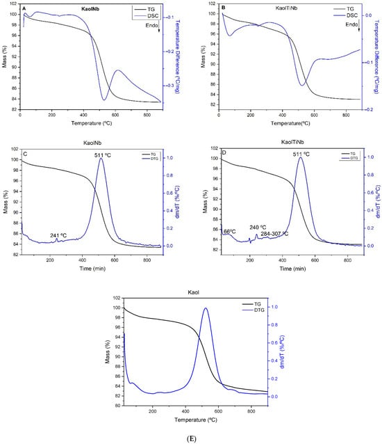 TG and DSC curves of KaolNb (A), KaolTiNb (B), DTG curves of Kaol Nb (C), and KaolTiNb (D) and Kaol (E).