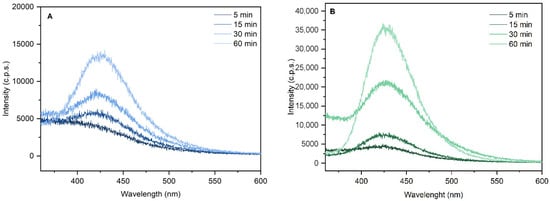 Emission spectra with excitation at 325 nm of 2-hidroxyterphtalyc acid resulting from hydroxylation reaction of terephthalic acid using KaolNb400 (A) and KaolTiNb400 (B) as photocatalyst.