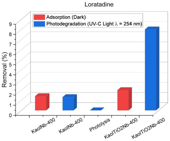 Figure 10 shows that both materials attained negligible Loratadine removal via adsorption, achieving approximately 2%. However, under UV-C irradiation, a modest increase to 8% removal was observed after 120 min. Notably, spectroscopic analysis indicated a shift in Loratadine bands, suggesting the formation of transformation products upon light exposure. Given Loratadine’s inherent stability and resistance to complete oxidation by advanced oxidation processes (AOPs), achieving full mineralization, supported by the limited literature, remains a significant challenge. The addition of H2O2 increased the removal efficiency from 2 to 8%, with dark experiments also revealing that 2% lower adsorption occurs after 120 min, employing Kaol Nb and KaolTiNb400, emphasizing the necessity of UV light to induce the photodegradation mechanism.