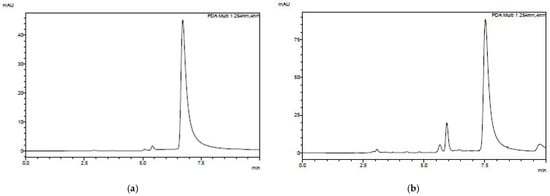 Chromatographic analyses: Performed using a Shim-pack VP-ODS column (250 mm × 4.6 mm i.d., 5 µm; Shimadzu) (Kyoto, Japan) with a flow rate of 1 cm3 min−1 and UV detection at 290 nm for Triaxon®. An isocratic mobile phase system consisting of 0.1% acetic acid in water (solvent A) or acetonitrile (solvent B) was used at 80/20% for 10 min. The column temperature was set at 40 °C, and the injected volume was 10.0 μL.