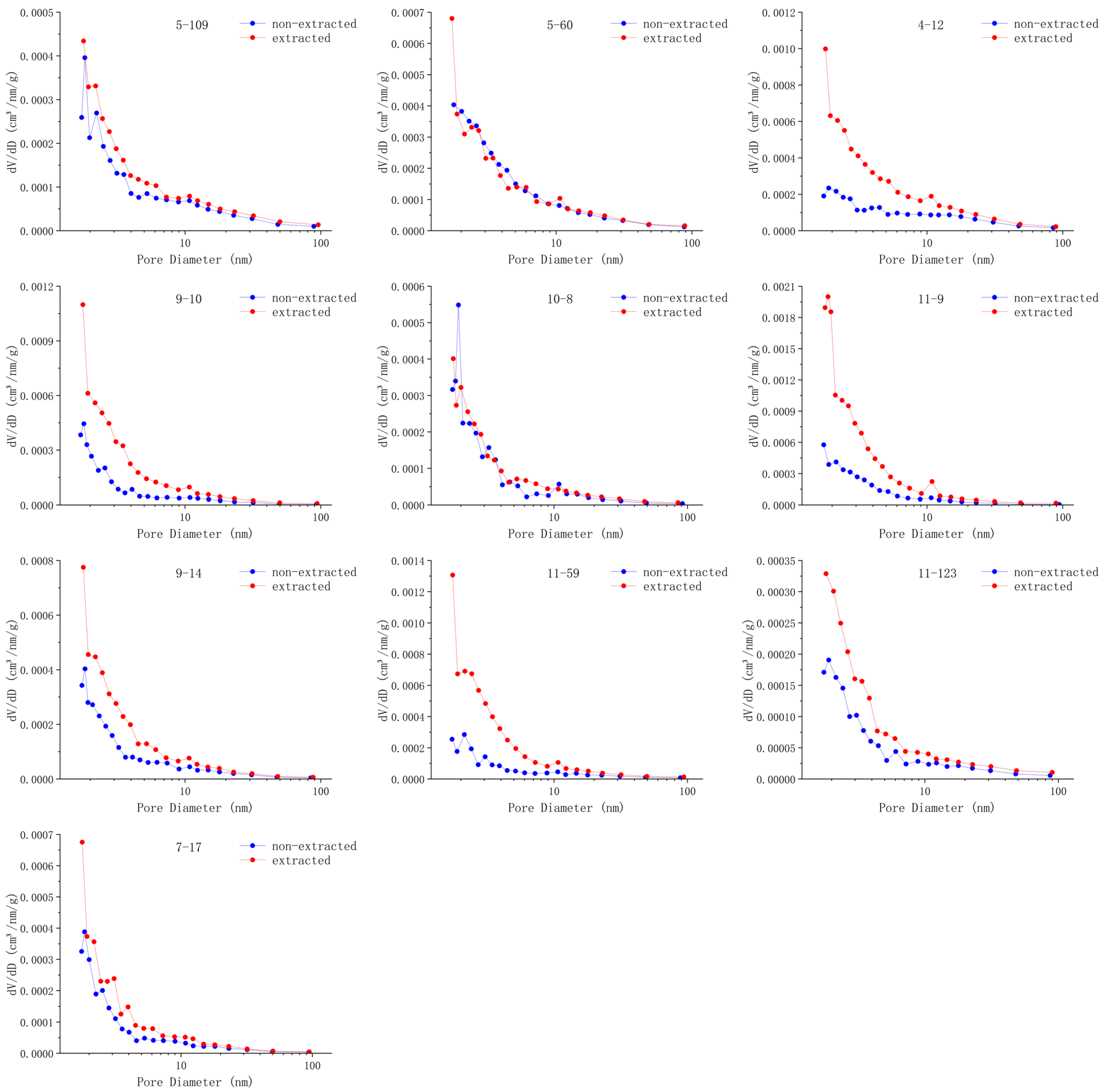 - After extraction, the specific surface area (SSA) and total pore volume (TPV) of shale samples in the study area are both higher than those before extraction, while the average pore diameter (APD) exhibits inconsistent changes. Additionally, the pore size distribution becomes more concentrated, with improved pore homogeneity and connectivity. Compared to shale with medium organic matter abundance, shale with high organic matter abundance shows a more concentrated pore size distribution, as well as better pore connectivity and homogeneity.