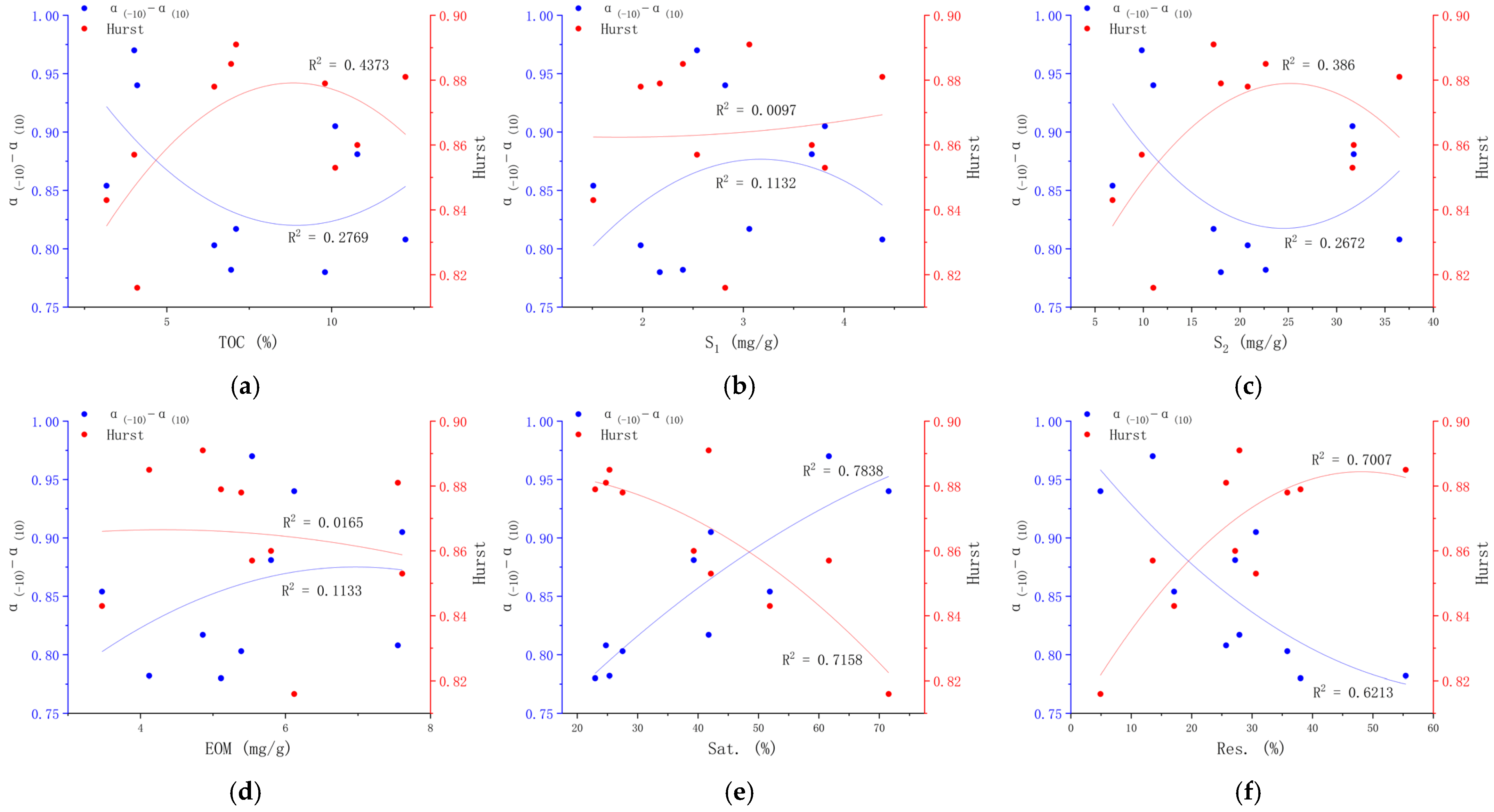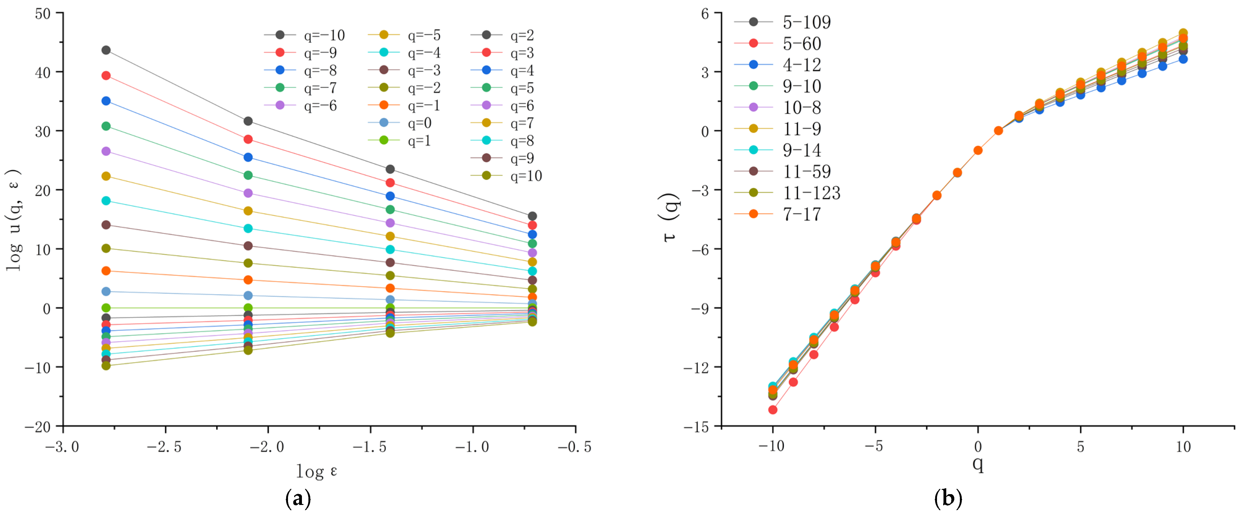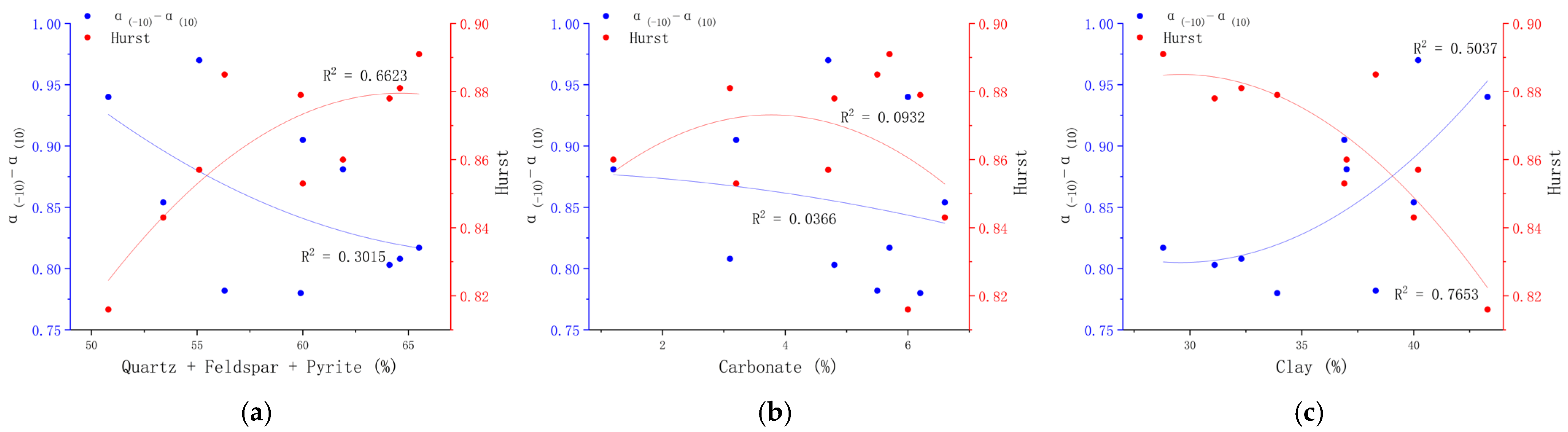 - Zhong, B.; Zhu, Y.; Feng, G.; Xiang, J.; Wang, Y. Matrix Compression and Pore Heterogeneity in the Coal-Measure Shale Reservoirs of the Qinshui Basin: A Multifractal Analysis. Fractal Fract. 2024, 8, 580. [Google Scholar] [CrossRef]