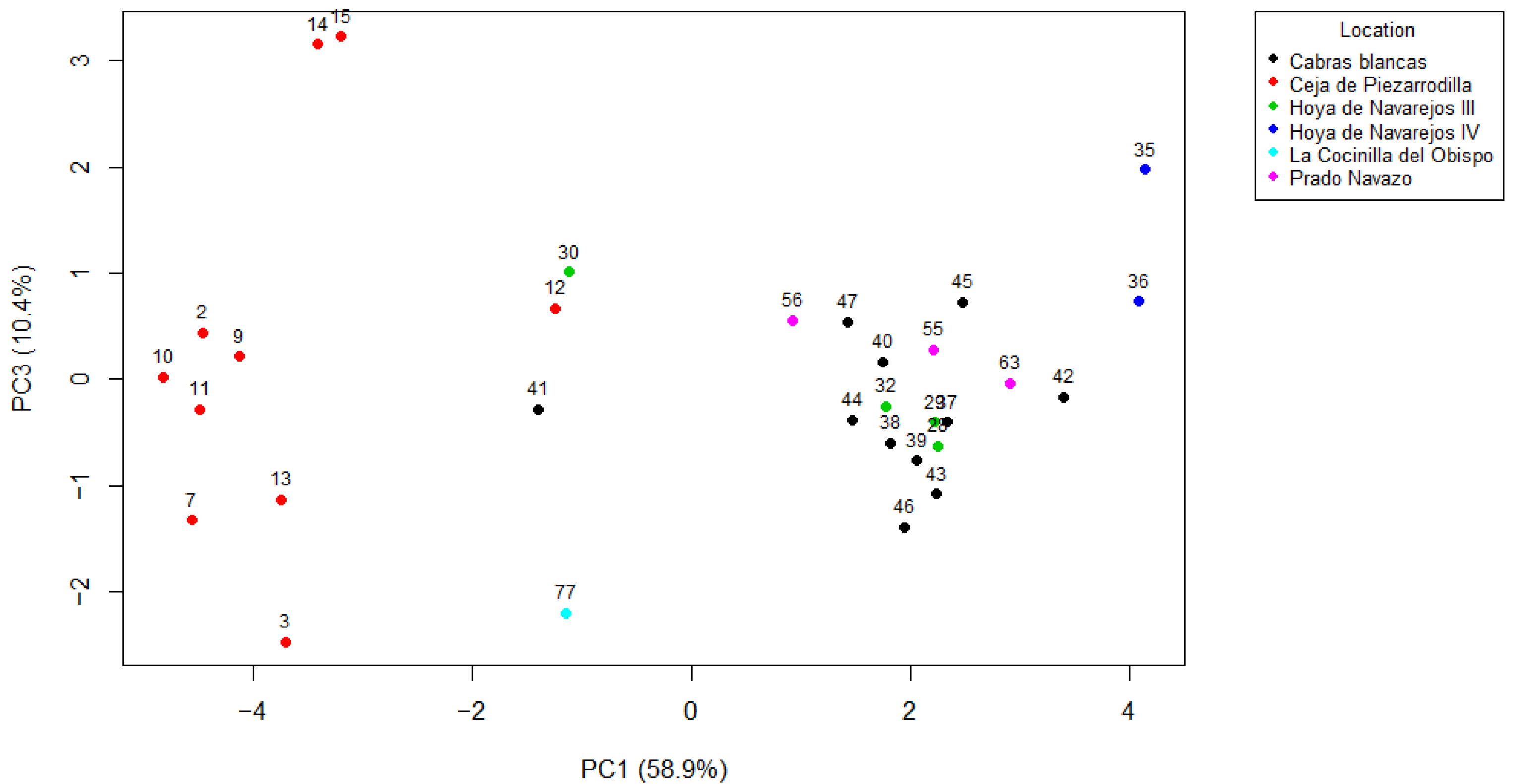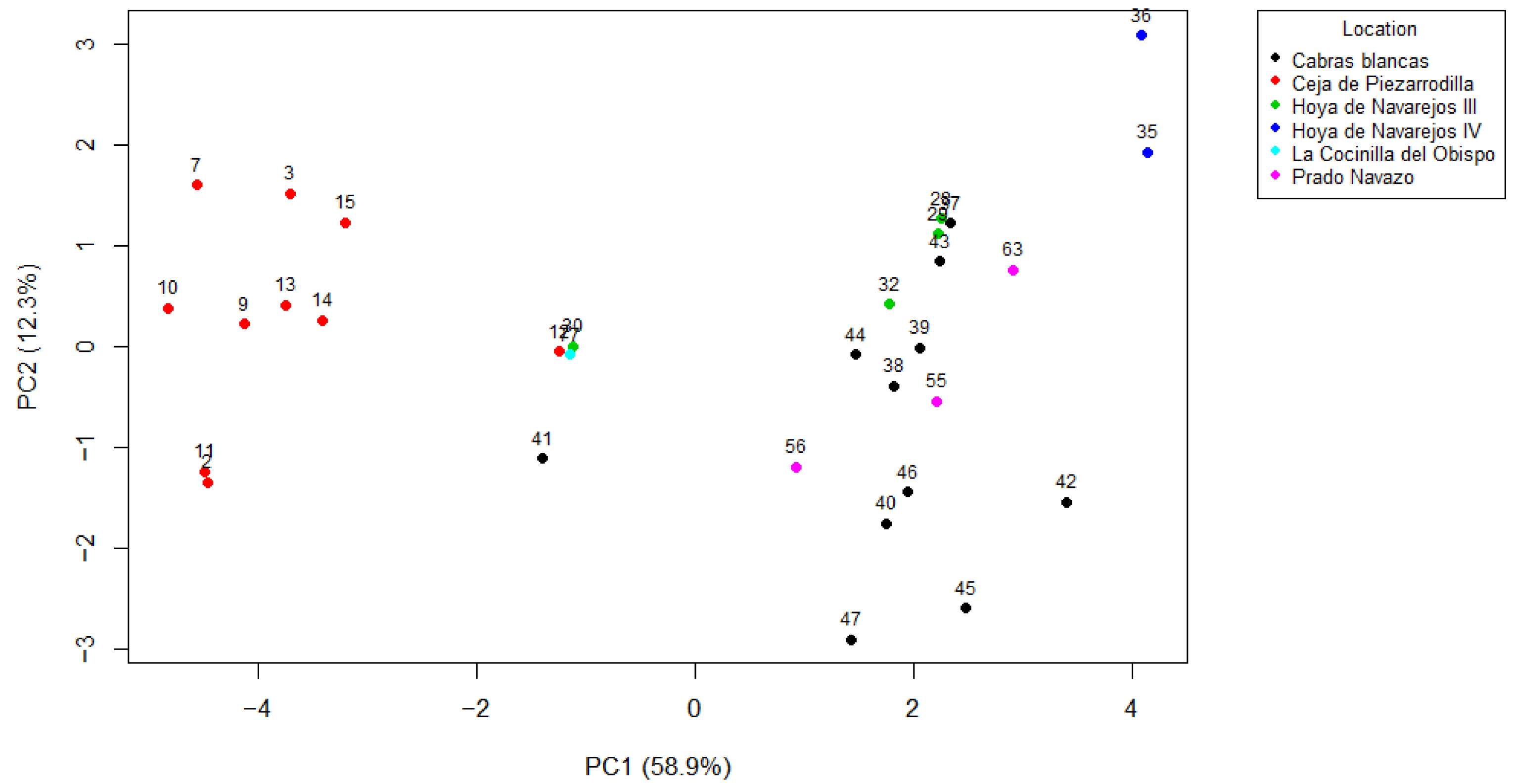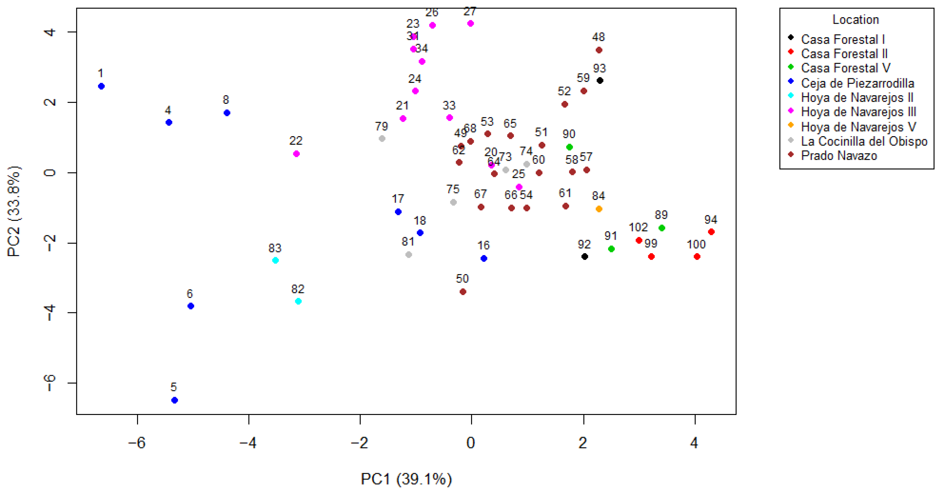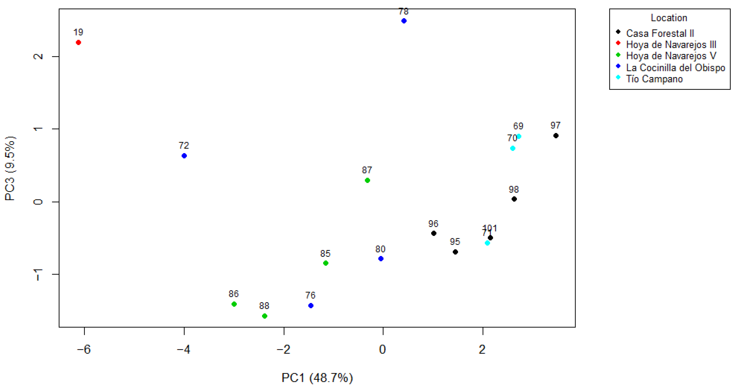 n = 1 for Hoya de Navarejos V white, La Cocinilla del Obispo black) constrain generalizability, though bootstrap validation (94.1–100.0% accuracy) affirms robustness for adequately sampled locations.