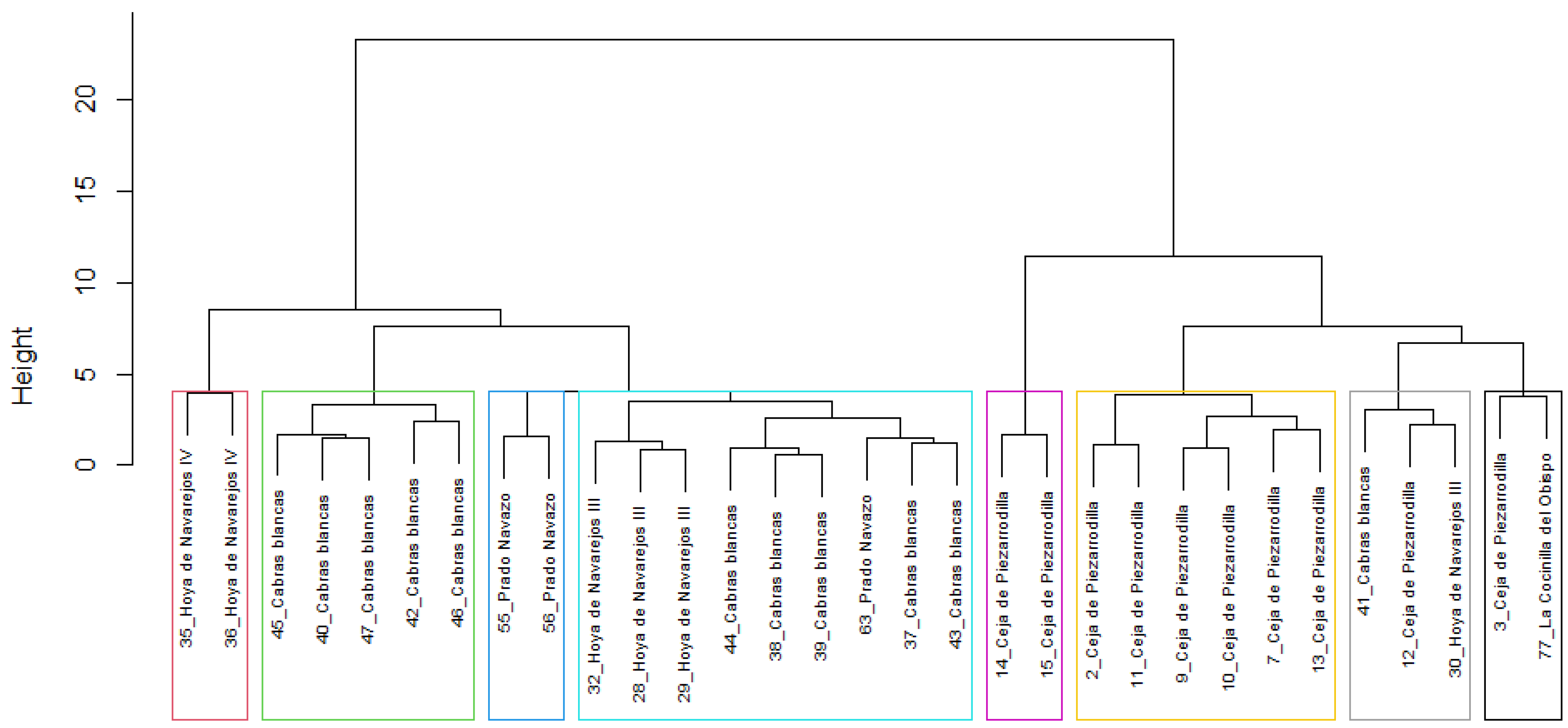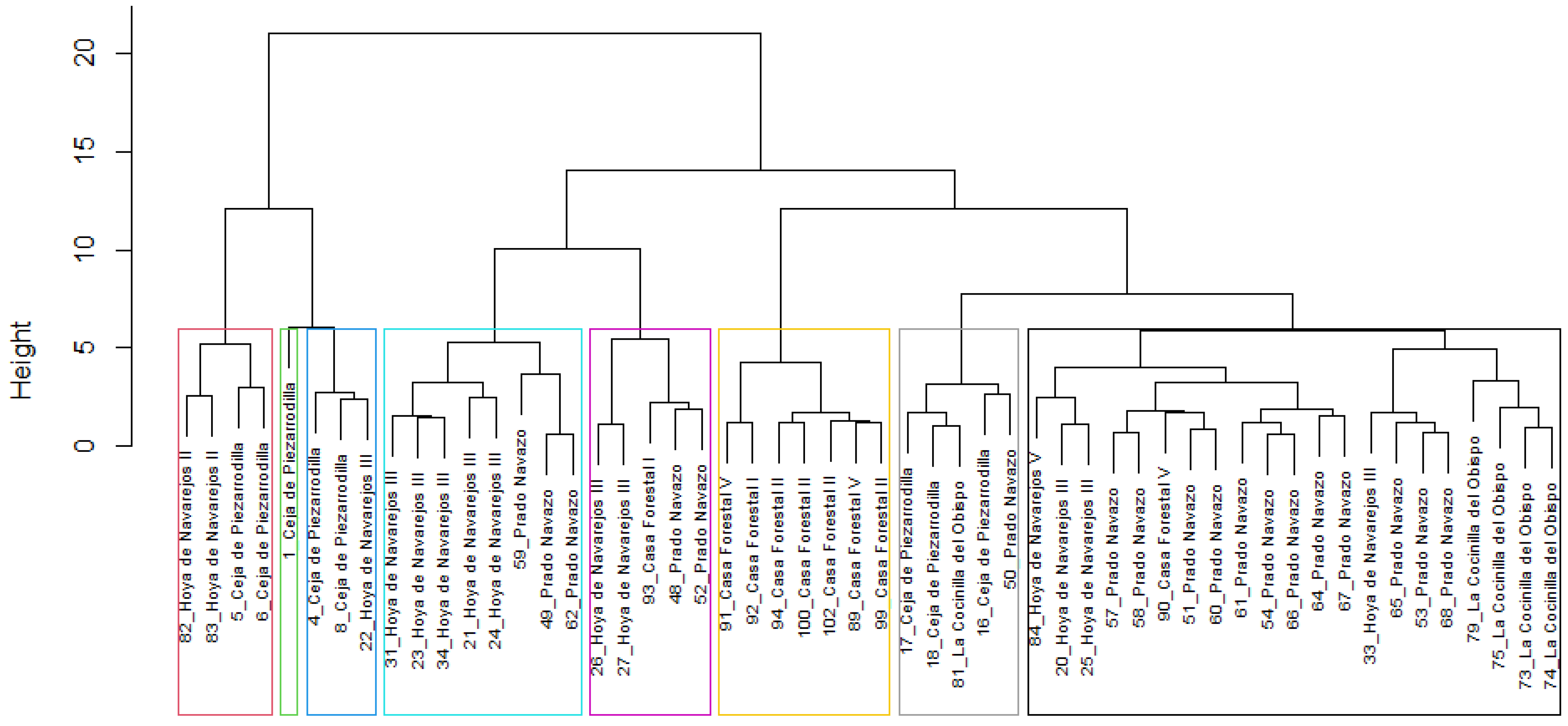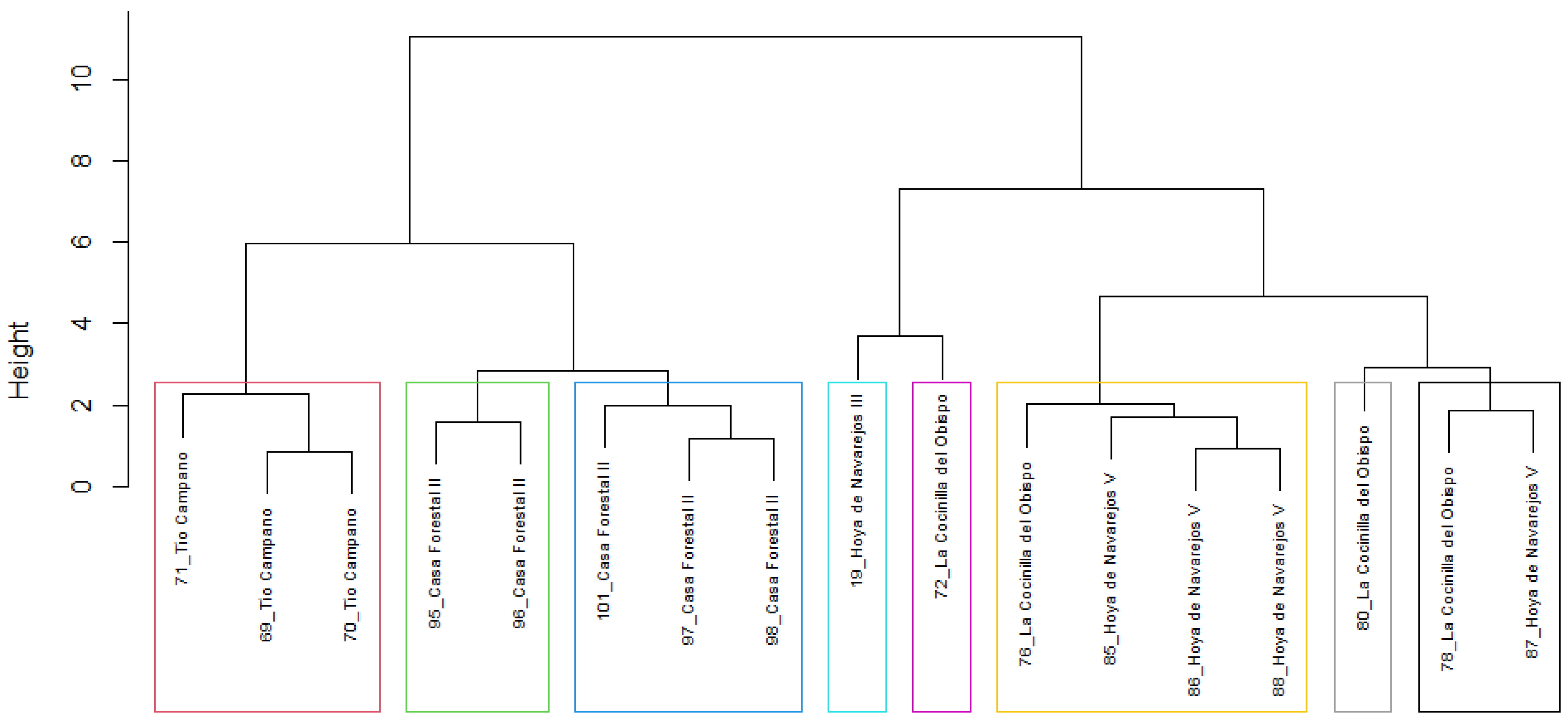n ≥ 3) for multiple colors, enabling cross-color comparisons: Ceja de Piezarrodilla, Hoya de Navarejos III, and Prado Navazo (white and black/black-over-white); Casa Forestal II (white and red).