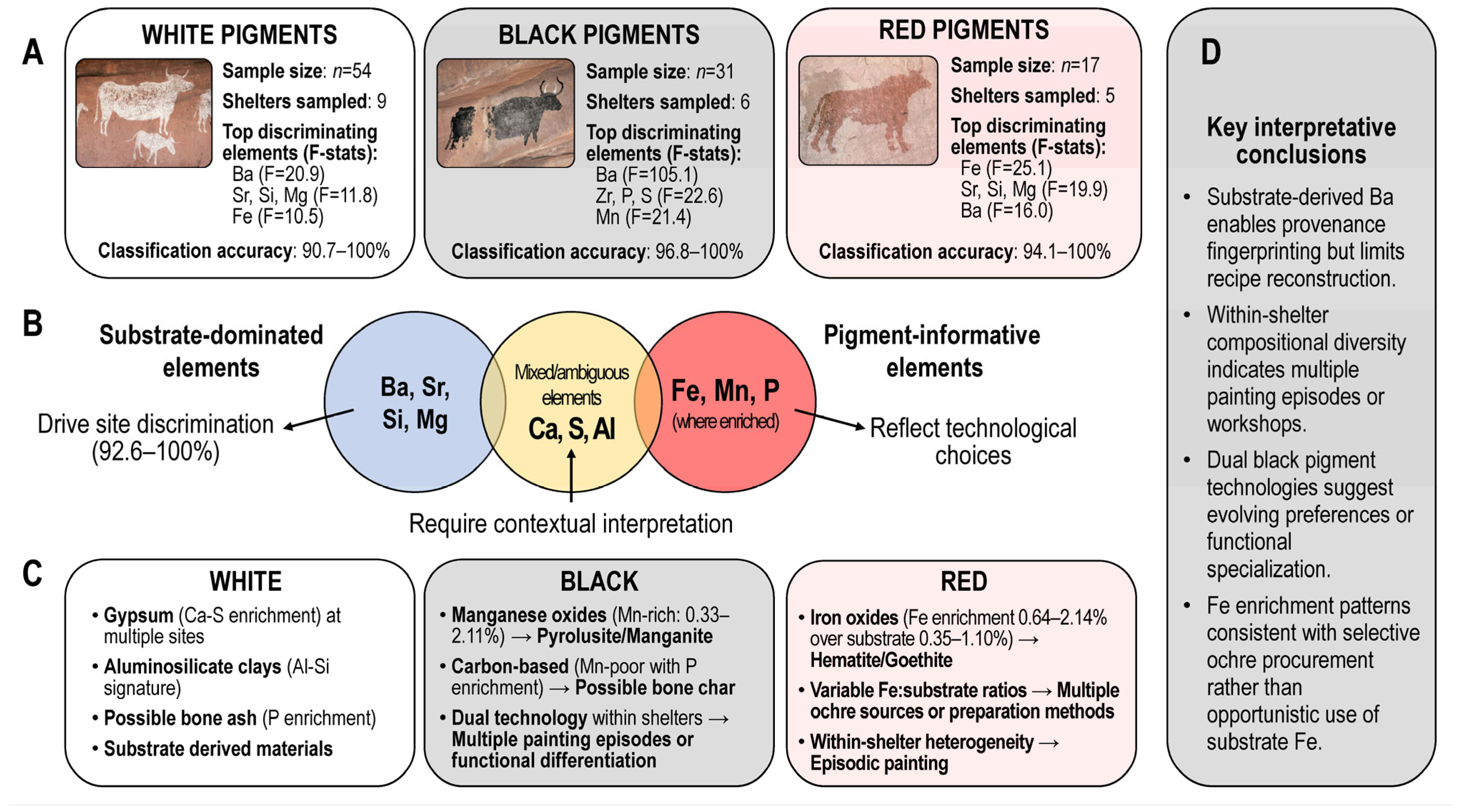 This Discussion synthesizes the multivariate and univariate patterns documented in the Results through the lens of archeological and technological questions. The following subsections are organized around five interpretive themes: (4.1) geochemical interpretation of raw pigment compositions and their implications for material selection; (4.2) universal and pigment-specific discriminating elements and what they reveal about geological vs. cultural factors controlling compositional variation; (4.3) shelter-specific signatures and within-shelter heterogeneity as evidence for multiple painting episodes and technological complexity; (4.4) insights into pigment technology and raw material procurement; (4.5) methodological considerations, limitations, and future directions; and (4.6) archaeological and technological implications.