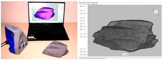 A total of two methods were used to model in 3D particles contained in each of these groups represented by the different aspect ratios. The first method was 3D laser scanning using the Artec Space Spider (Artec 3D—Senningerberg/Luxembourg) (Figure 2). It uses laser triangulation technology to accurately measure the shape, size, and features of an object, with a point accuracy of 0.05 mm and a mesh resolution of 0.3 mm. Processing and fusion of the pictures obtained by scanning were carried out using Artec Studio 18 professional software (version 18.1.3.6), which enabled obtaining the 3D particle shape model in STL format (Figure 2).