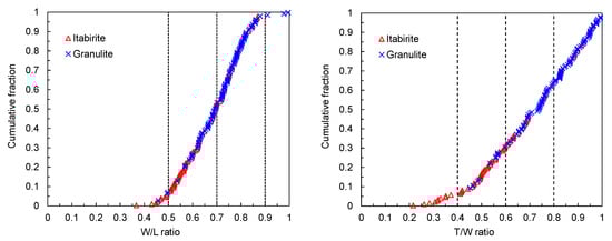 Figure 4 shows the cumulative distribution of the aspect ratios W/L and T/W obtained from the digital image analysis of the itabirite #1 and the granulite particles. A total of 103 particles for granulite and 63 particles for itabirite #1 were used for the aspect ratio characterization. The aspect ratio results show that granulite particles have a higher W/L ratio, meaning they are less elongated than those of itabirite. Differences in flakiness, represented by the T/W ratio, were less evident between the materials, but itabirite presented generally lower values and, therefore, higher flakiness than granulite. Based on the distributions of aspect ratios, four groups were proposed for each aspect ratio, resulting in a total of 16 groups (Table 3).