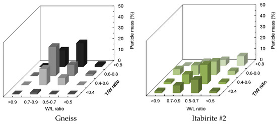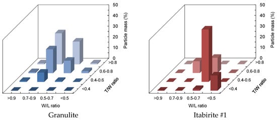 On the basis of the proposed division in groups, the distribution of particle shapes in weight for granulite and itabirite #1 was estimated, and a summary is given in Figure 5. While the granulite sample contains particles with aspect ratios in the intermediate to high values (higher cubicity), the itabirite #1 sample presents more flaky and elongated particles, associated with its lower W/L and T/W ratios, respectively.