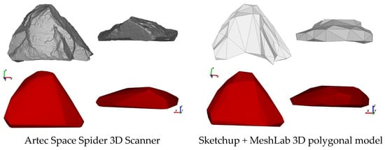The second method consisted of using the images collected during the shape characterization (Figure 1) as a basis for CAD modeling in the SketchUp software, version 2020, representing the shape of the particles as simple polygons (Figure 3). The “rough” 3D particle shape model was filtered using the MeshLab software, version 2020.07, to generate smooth and convex geometries applying the “close holes” and, the “Taubin Smooth” filter. In addition, MeshLab was used to remove some surface imperfections of the particles without altering their aspect ratio (Figure 3).