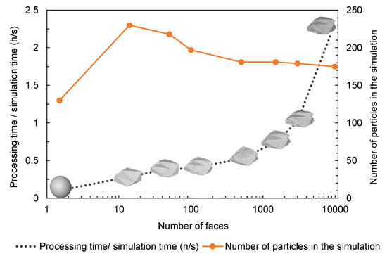 Computational effort (processing hours per 1 s of simulation) and the number of particles in the simulation as a function of particle geometry complexity (number of faces).