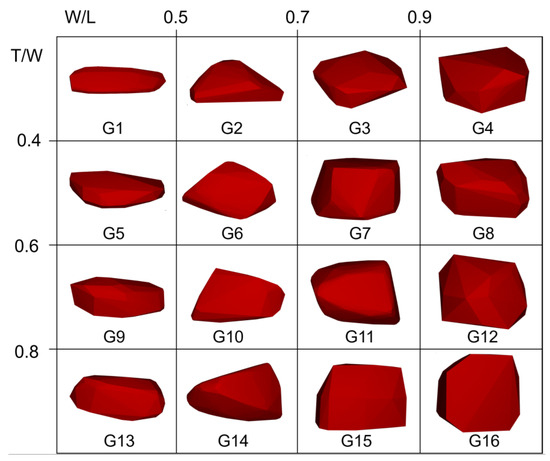 Figure 8 shows the 3D particle shape models imported into the Rocky DEM simulator to represent the 16 aspect ratio groups. Since no particles were found in samples of itabirite #1 and granulite for groups G4 and G16, the meta-particles were created solely on the basis of the mean aspect ratios of the group. Additionally, the 3D shapes imported into the Rocky DEM simulator for groups G2, G6, G7, G11, and G14, were the 3D models obtained using the Artec Space spider 3D scanner and imported into the Rocky DEM simulator using the option “Convert the shape to convex”. Figure 8 shows the variation in the particle geometry across the groups: whereas particles in group 1 are elongated and flaky, those in group 16 approximate cubic shapes. In all, meta-particles were modeled containing from 41 to 90 faces and from 78 to 173 vertices (Table 6). Files containing the particle shapes are provided in the Supplementary Materials.